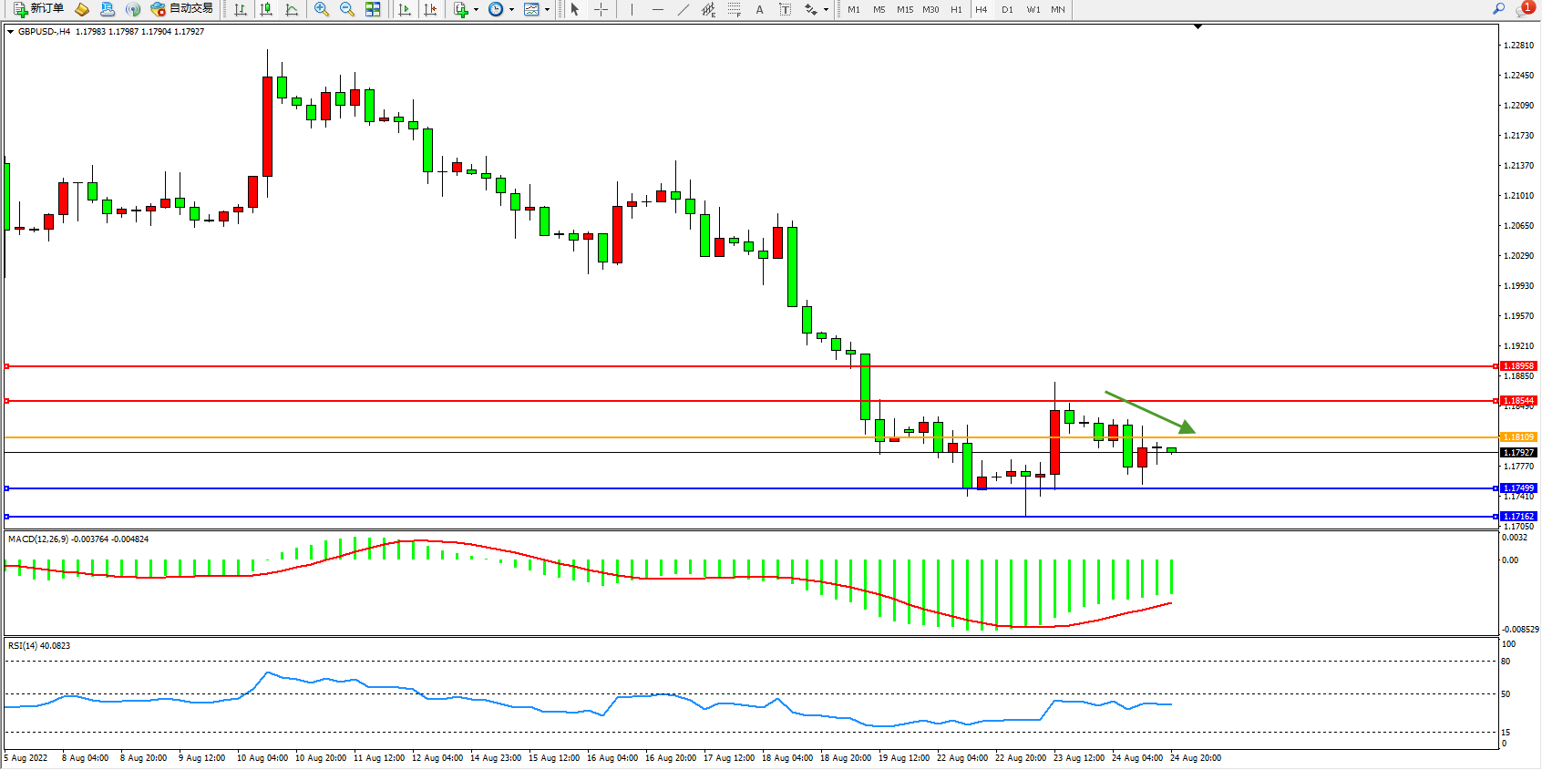 交易策略:1.18109下方看跌,目标1.17499、1.17162