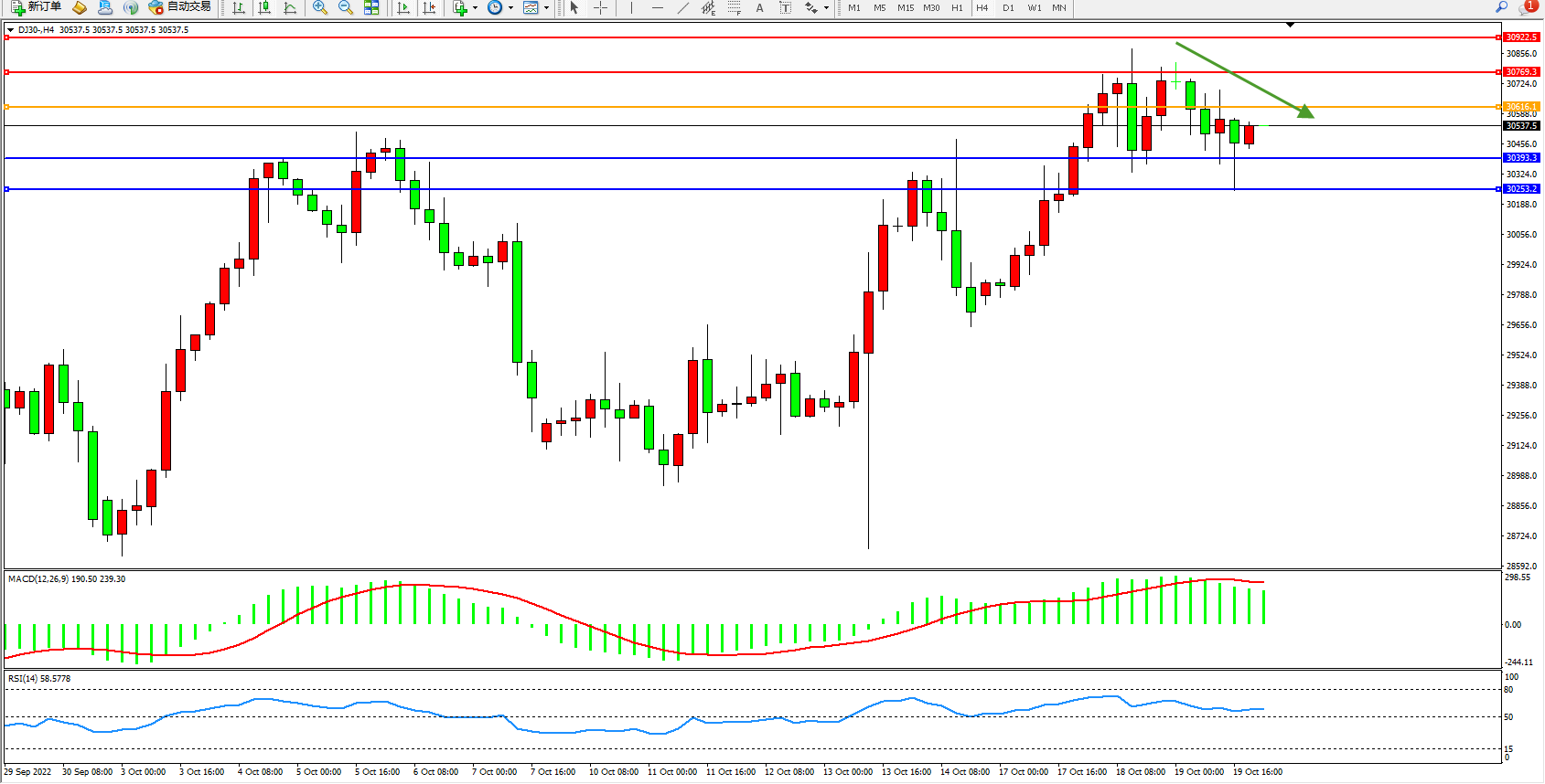 道琼斯指数10月19日(周三)收盘下跌98.54点,跌幅0.32%,报30425.26点;预计强劲的劳动力市场和消费者需求将缓冲2023年美国潜在经济衰退带来的影响。消费者支出将推动美国实际GDP在2022年下半年适度扩张,每季度增长0.3%左右。