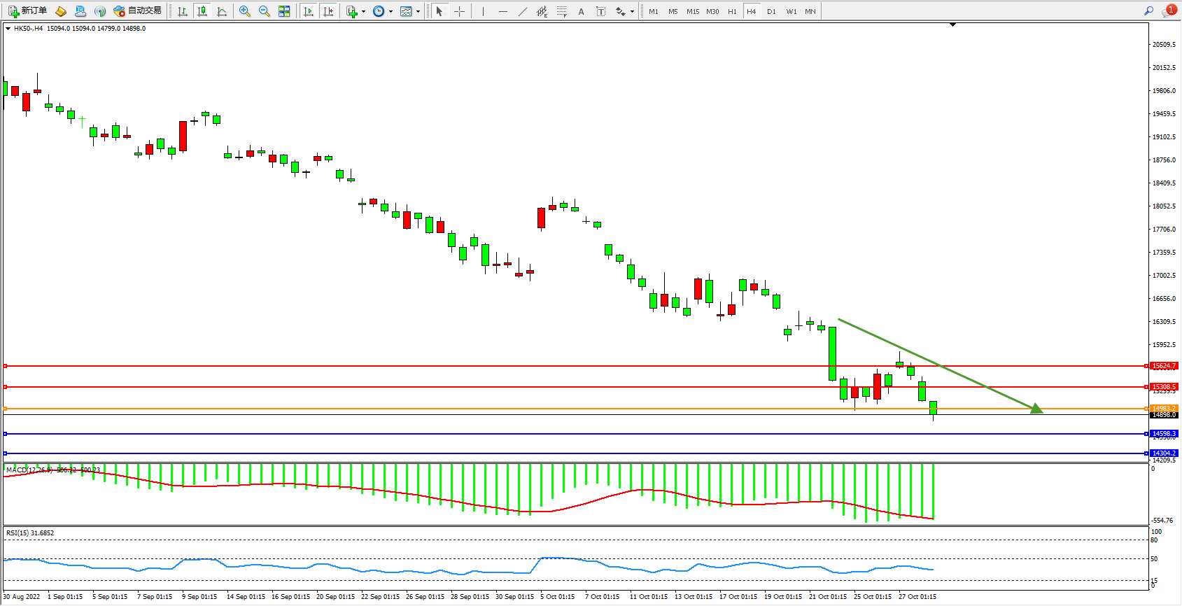 香港恒生指数10月28日(周五)收盘下跌564.88点,跌幅3.66%,报14863.06点;港股三大指数午后跌幅急剧扩大,续创2009年4月以来新低;恒生科技指数跌5.56%,国指跌4.08%。南下资金全日净流入54.84亿港元,大市成交额为1246亿港元。大型科技股午后持续下挫,阿里巴巴跌4%。iPhone季度营收不及预期,港股苹果概念股跳水。