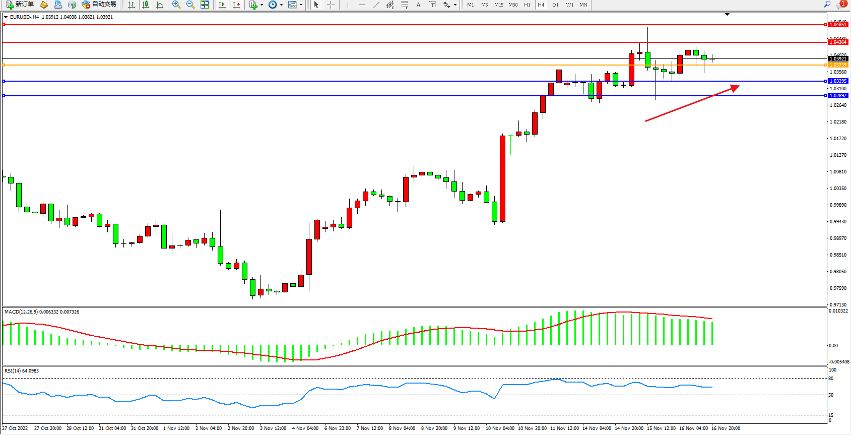 欧元美元EURUSD—4小时K线图显示: