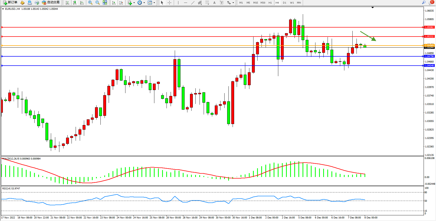 欧元美元EURUSD—4小时K线图显示: