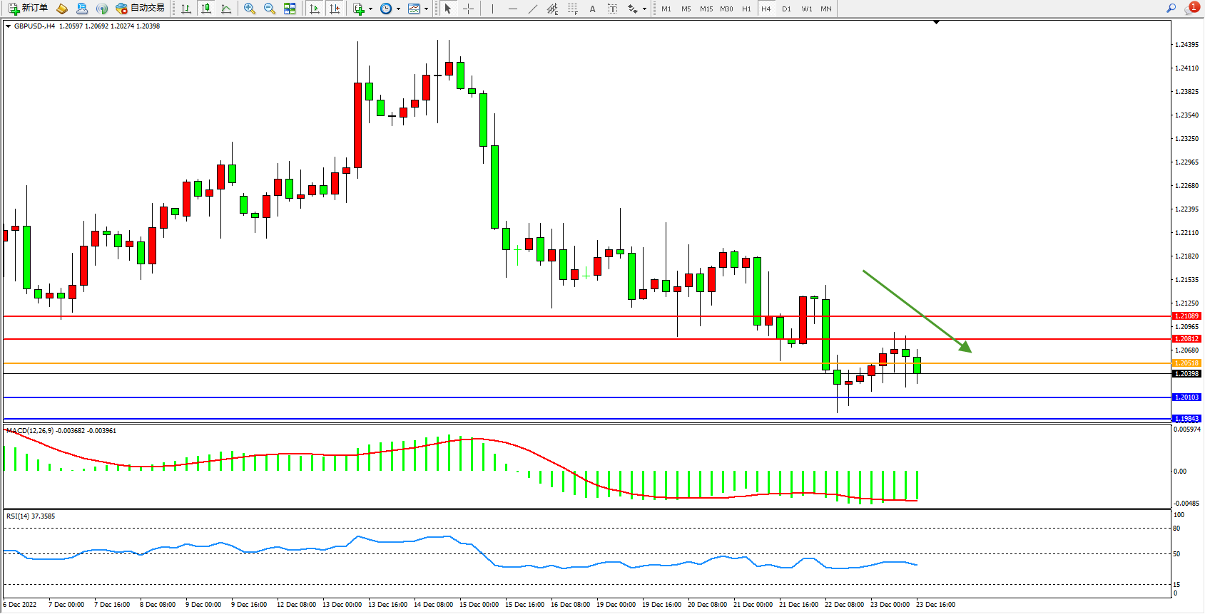英镑兑美元维持1.20398附近震荡,英国可能将继续表现不佳。预计英国将在2023年遭受主要发达经济体中最严重的衰退,因为货币和财政政策造成的阻力都很严重。英镑的下行风险居多,经济衰退的环境和对市场不稳定的敏感性可能会导致英镑/美元回到1.15-1.18的范围。周一圣诞节休市一日。