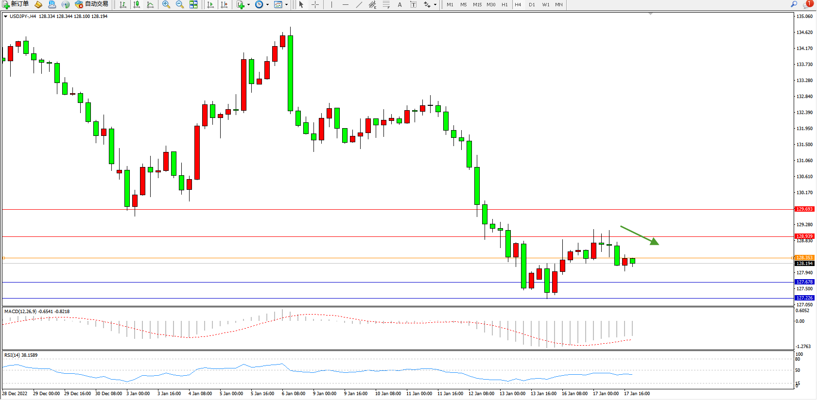 4小时图看:低位多头动力缓慢震荡上移,但下行趋势依旧,短期拉升后再度再度向下移动,MACD指标处于空头区域低位整理,RSI指标处于50均衡线下侧弱势徘徊;