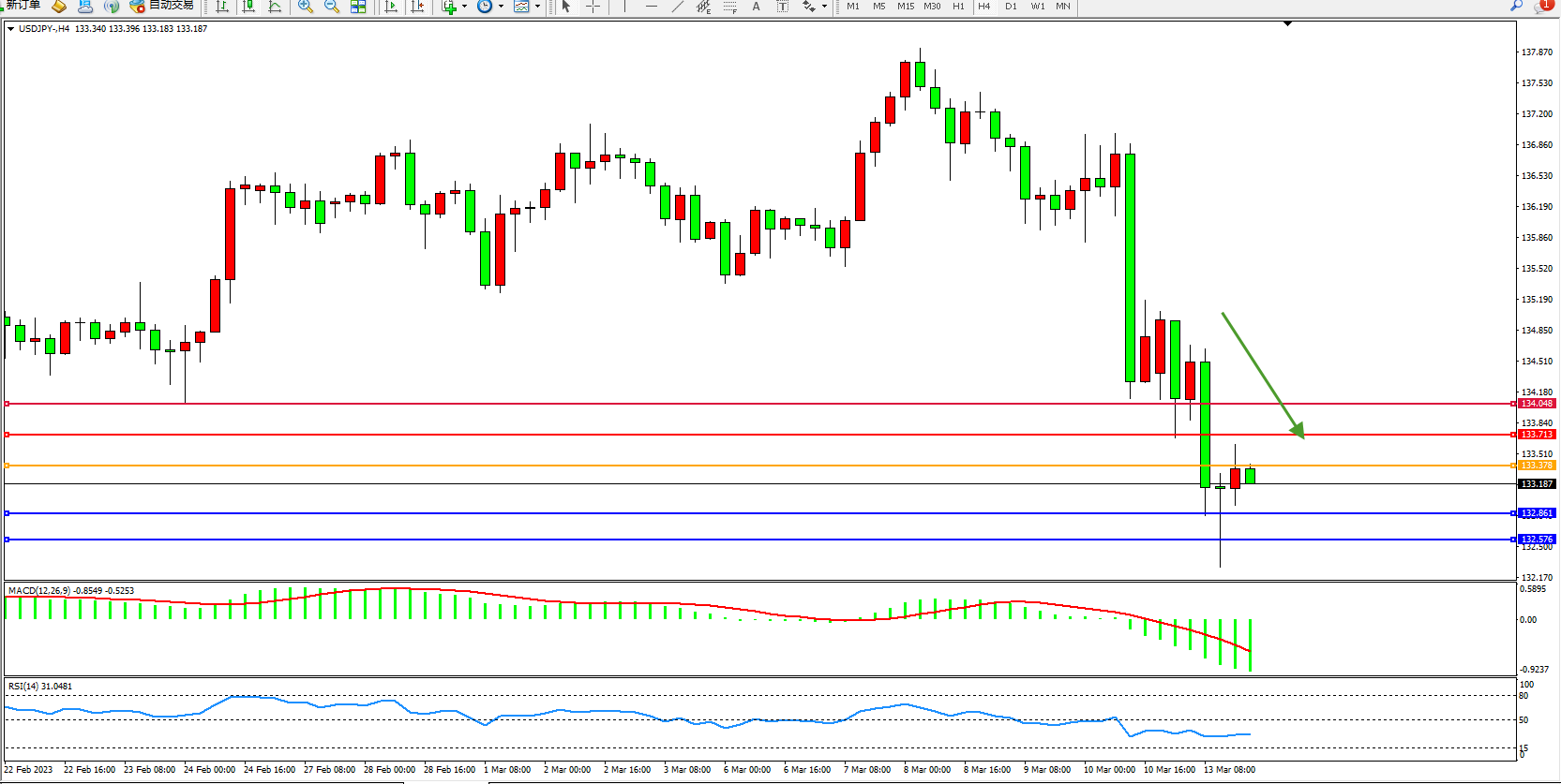 交易策略:133.378下方看跌,目标132.861 132.576