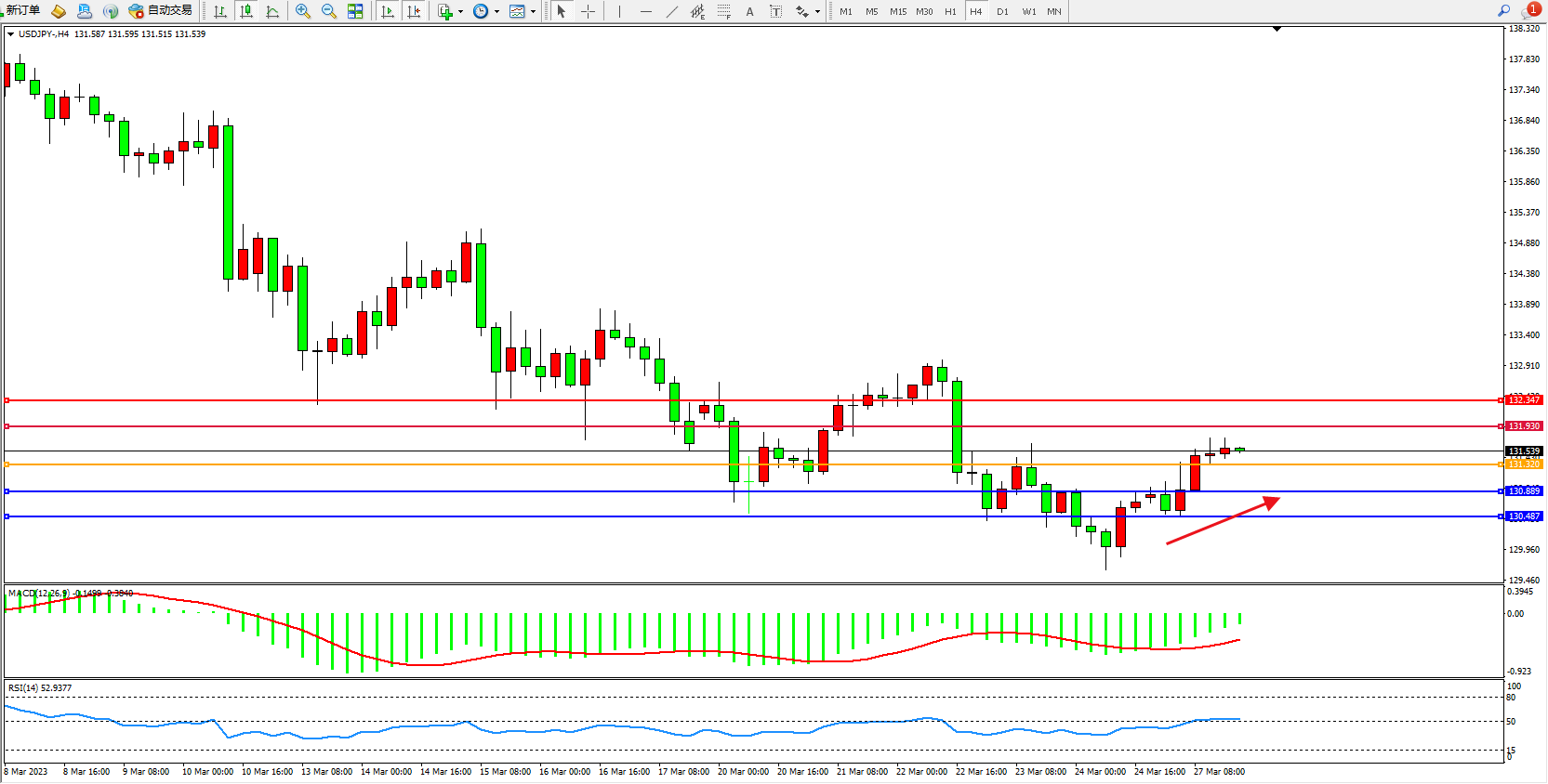 4小时图看:低位多头动力维持窄幅整理缓慢上行,市场看涨情绪开始缓慢涌现,多头不断低位向上移动,MACD指标处于空头区域整理上行,RSI指标处于50附近弱势徘徊;
