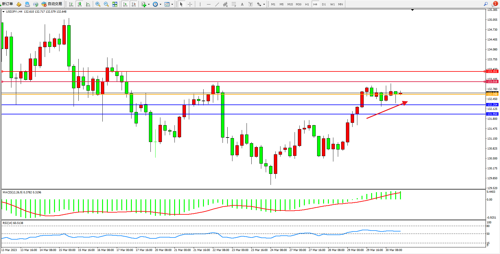 交易策略:132.598上方看涨,目标133.016  133.351