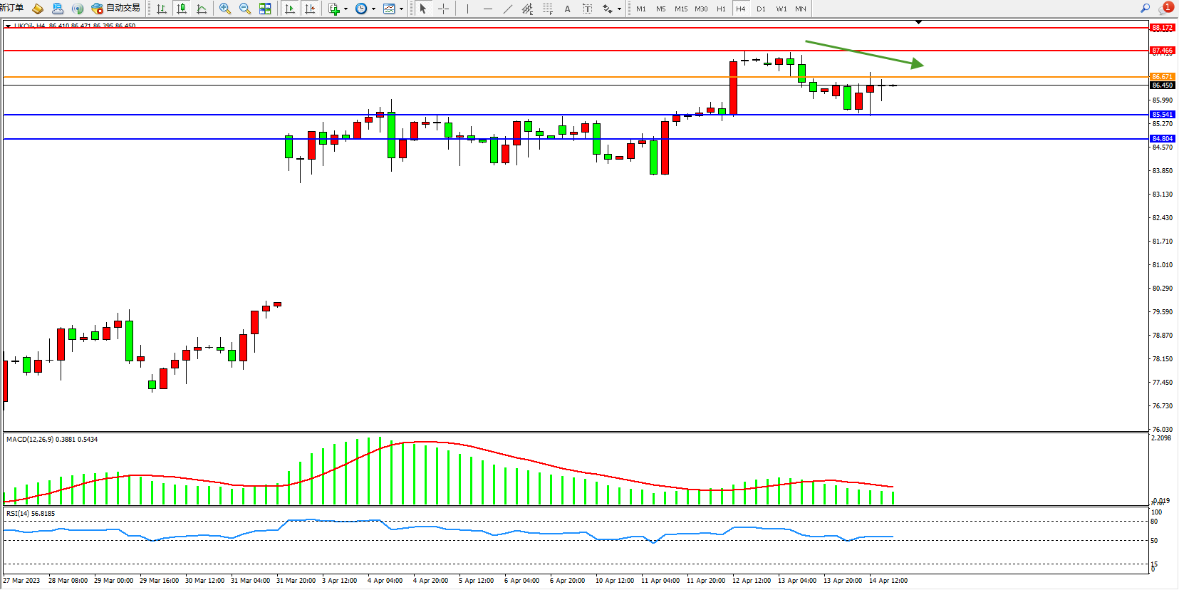 4小时图看:高位短期窄幅整理,市场空头动力开始缓慢涌现,多头逐渐减弱,MACD指标处于多头区域维持整理,RSI指标处于50均衡线上側徘徊;