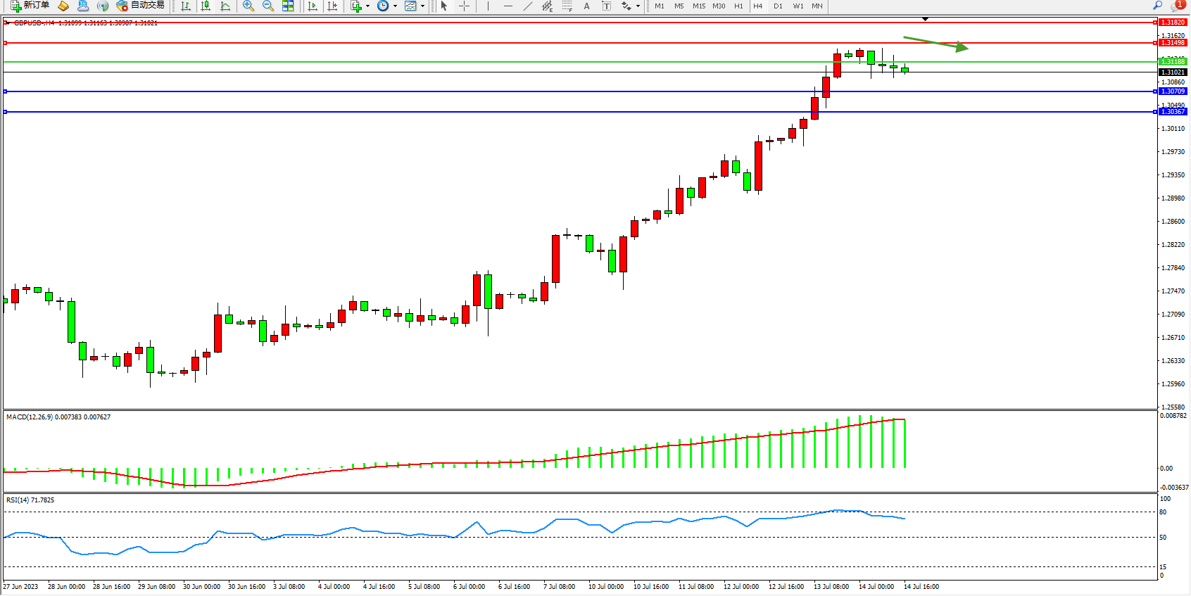 4小时图看:高位短期维持弱势徘徊,市场看涨情绪开始减弱,MACD指标处于多头区域高位徘徊,RSI指标处于多头区域平移整理;