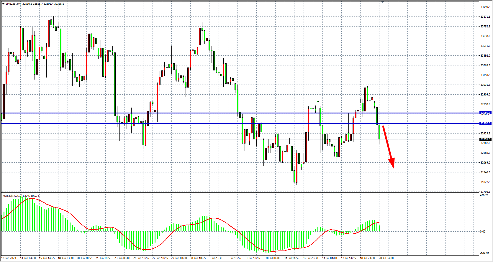 4小时图看,日经指数高位受阻回落,再度跌至32550下方,MACD量能于零轴之上缩量,趋势进入回调,阻力关注32550,支撑关注32680、32600。