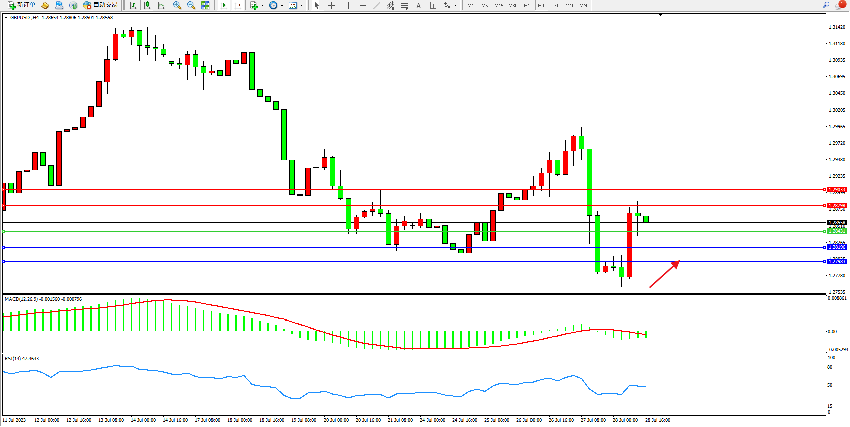 备选策略:1.28431下方看跌,目标1.28196  1.2798