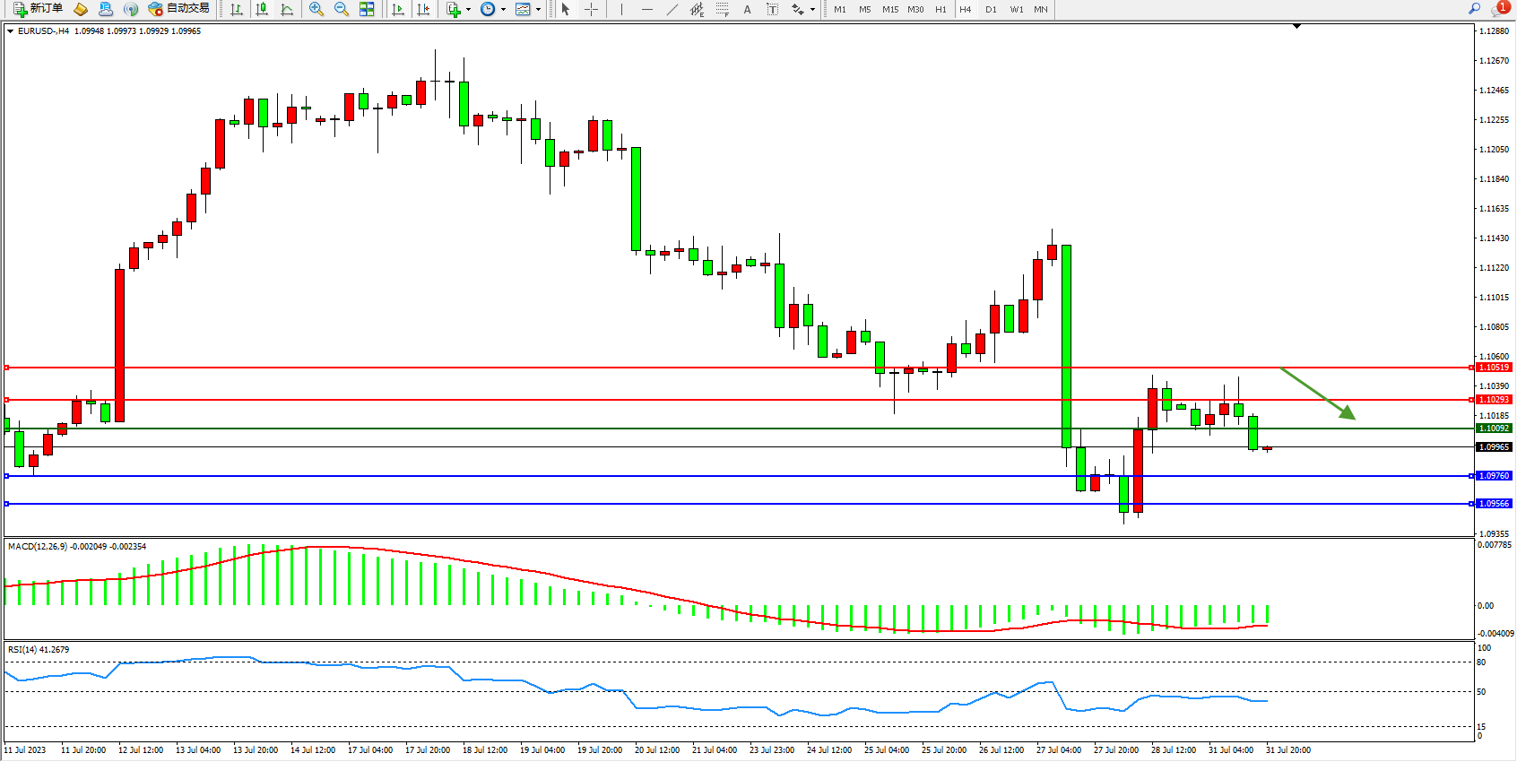 欧元美元EURUSD—4小时K线图显示: