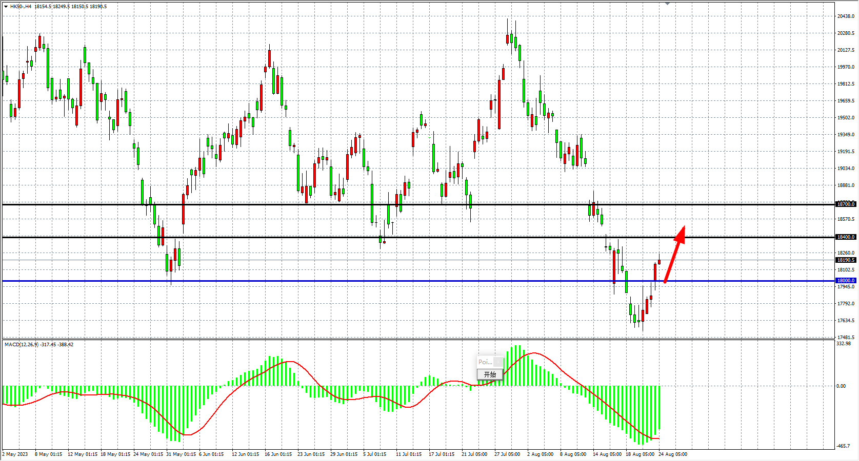 4小时图看,恒指进一步反弹上破18000关口,MACD量能于零轴下方有所缩减,支撑关注18000,上方阻力看18400-18700。