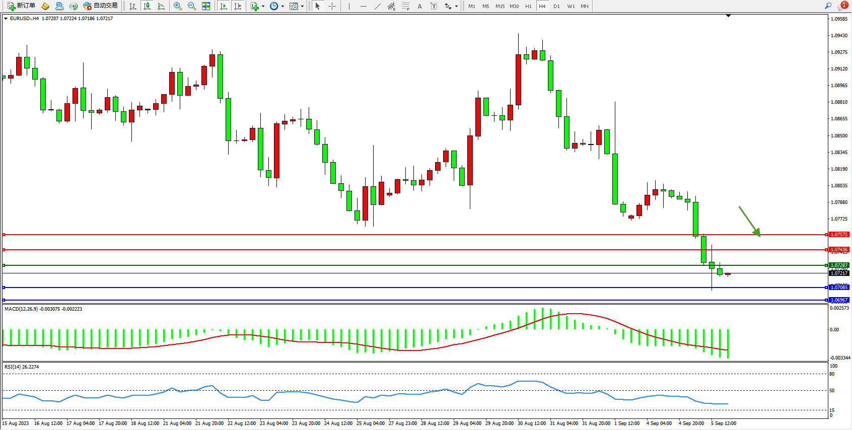 欧元美元EURUSD—4小时K线图显示: