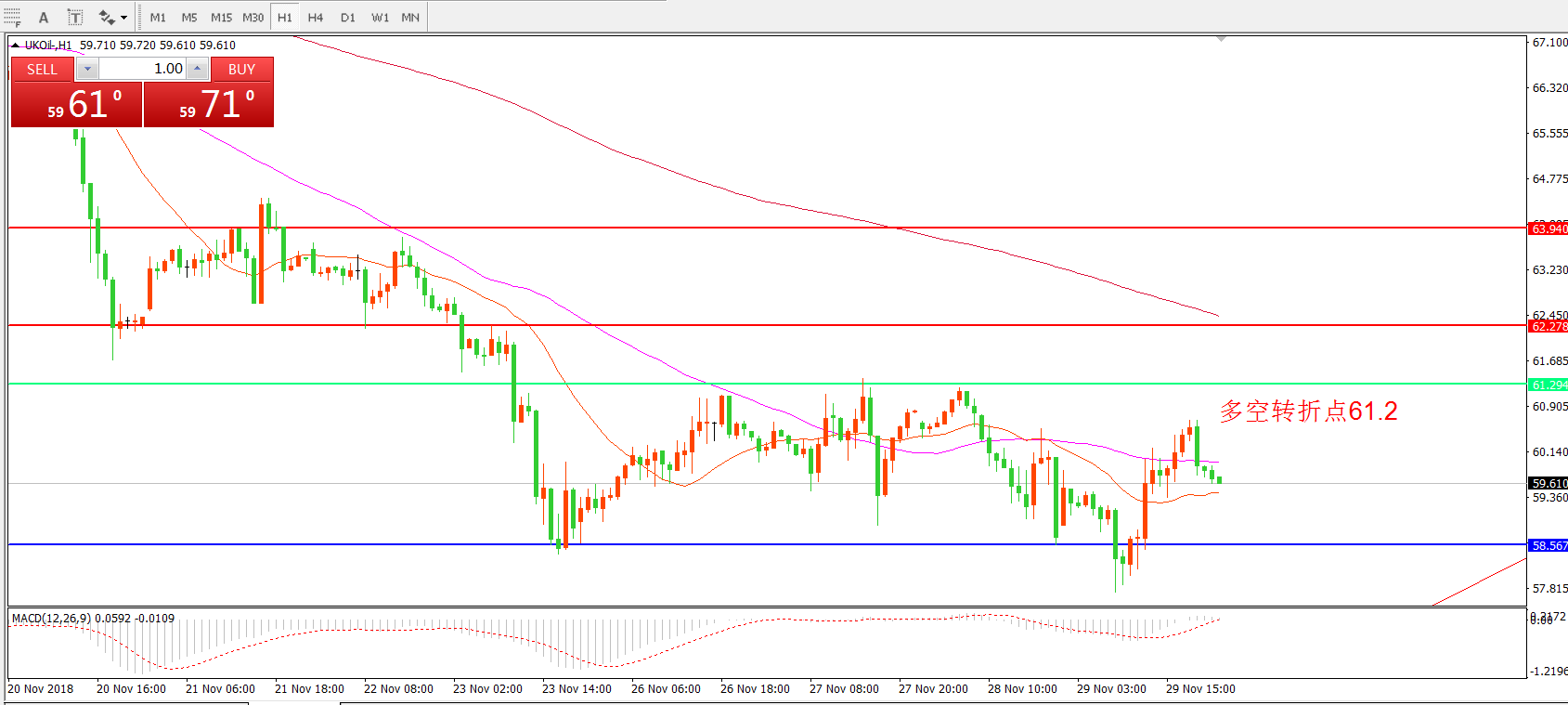 小时图看,油价快速下探58美元关口后快速反弹,但面对短期多空转折点61.20依然无力上行,整体走势偏弱,MACD绿柱缩短,整体思路依然以逢高做空为主。