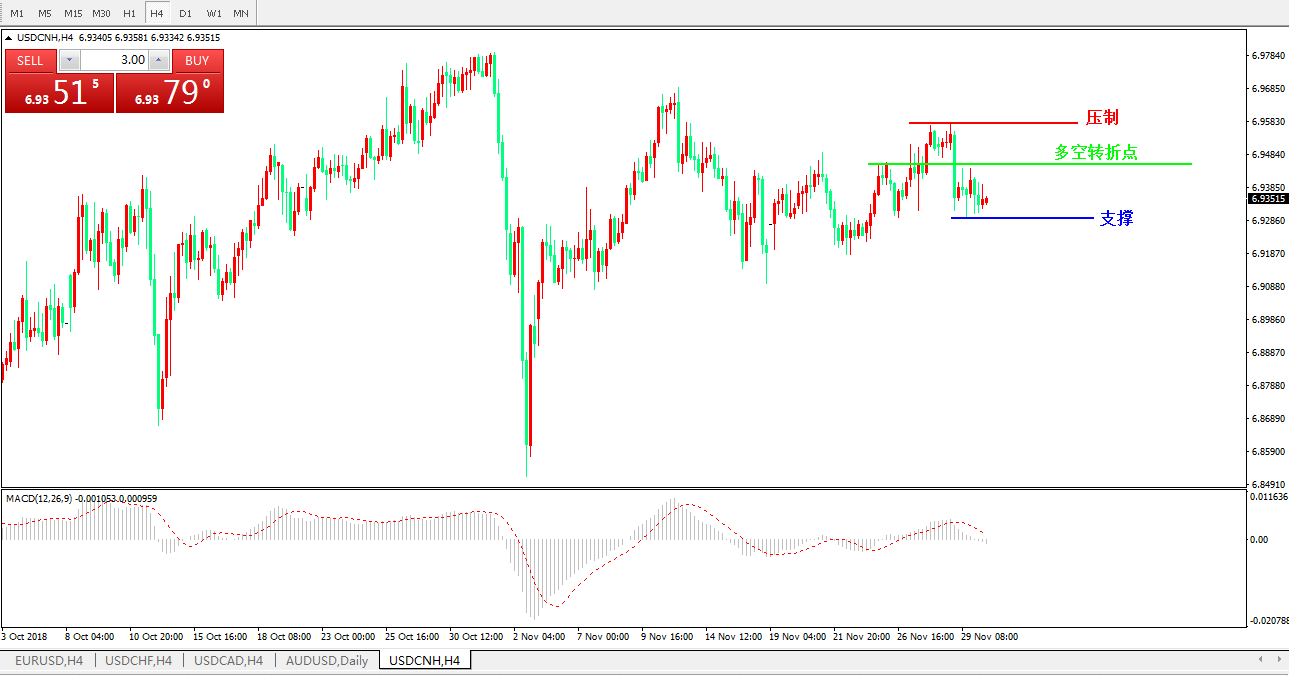 交易策略: 在6.9460之下,看跌,目标价位为6.9314,然后为 6.9208 。