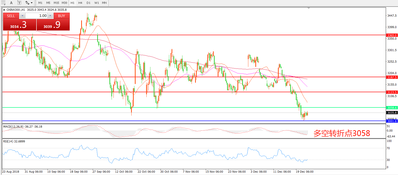 隔夜美股再度重挫,遭遇最差圣诞前夜。道指跌近3%,跌破22000点;标普跌破2400点进入熊市,创2017年4月以来新低。纳斯达克跌幅2.21%。日本日经225指数低开1.9%,为2017年9月中旬以来首次失守2万点。随后跌幅迅速扩大至4%。昨日A股全天成交量只有857亿元,市场信心依然低迷,全球股市惨遭血洗的情况下,中华指数300很难独善其身。