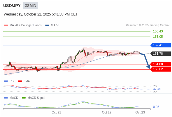 交易策略: 当 152.41 维持阻力位时,存在回归 150.62 的风险。