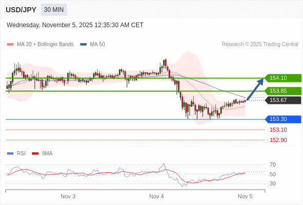 在 153.30 之上,看涨,目标价位为 153.85 ,然后为 154.10 。