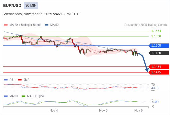 欧元/美元 当日内 : 看跌,在 1.1505 之下。
