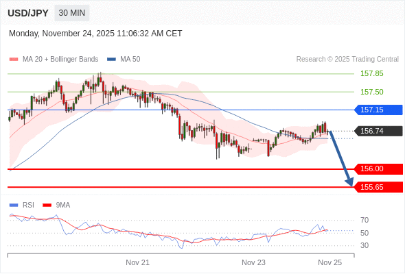 在 157.15 之下,看跌,目标价位为 156.00 ,然后为 155.65 。