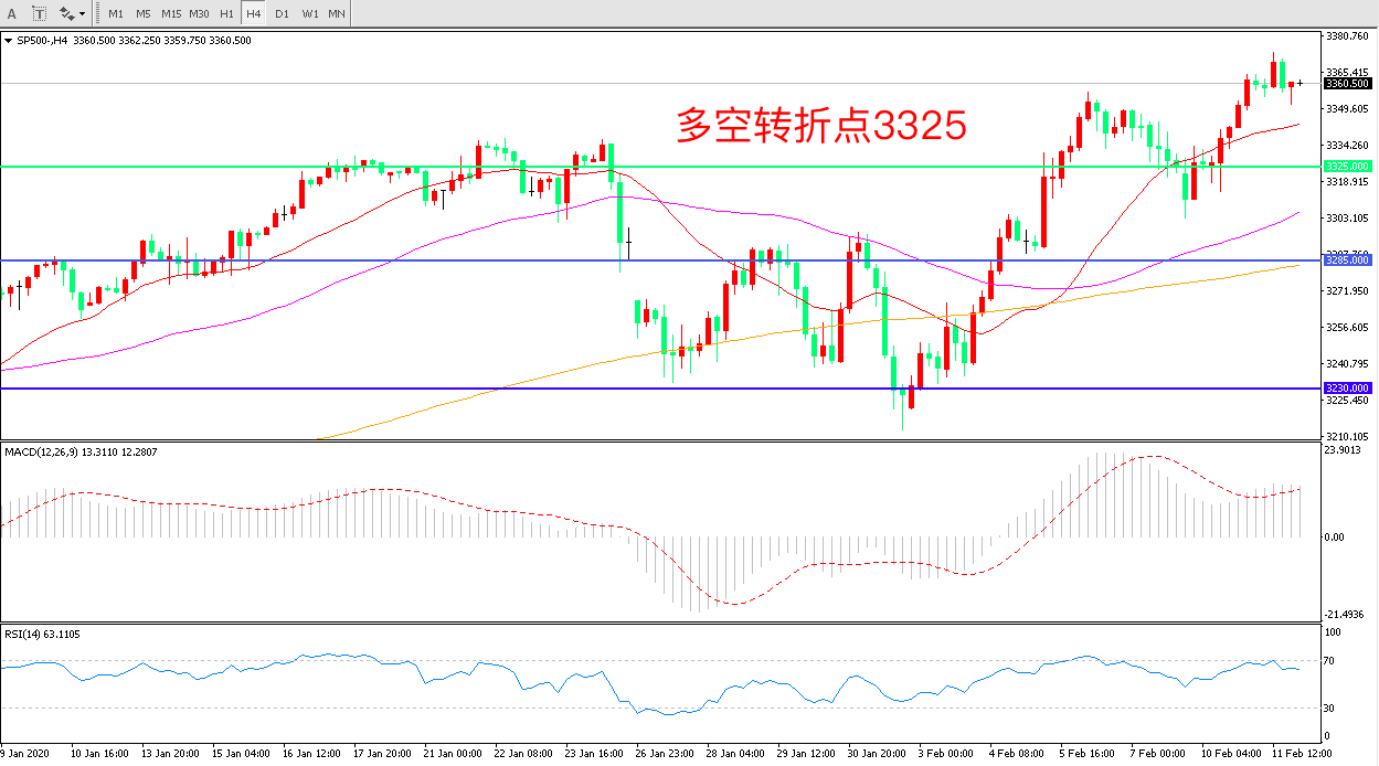 4小时图看,标普震荡回落,涨势有所调整,但均线系统成多头排列,MACD红柱增加,RSI指标向下,日内震荡上行概率较大。