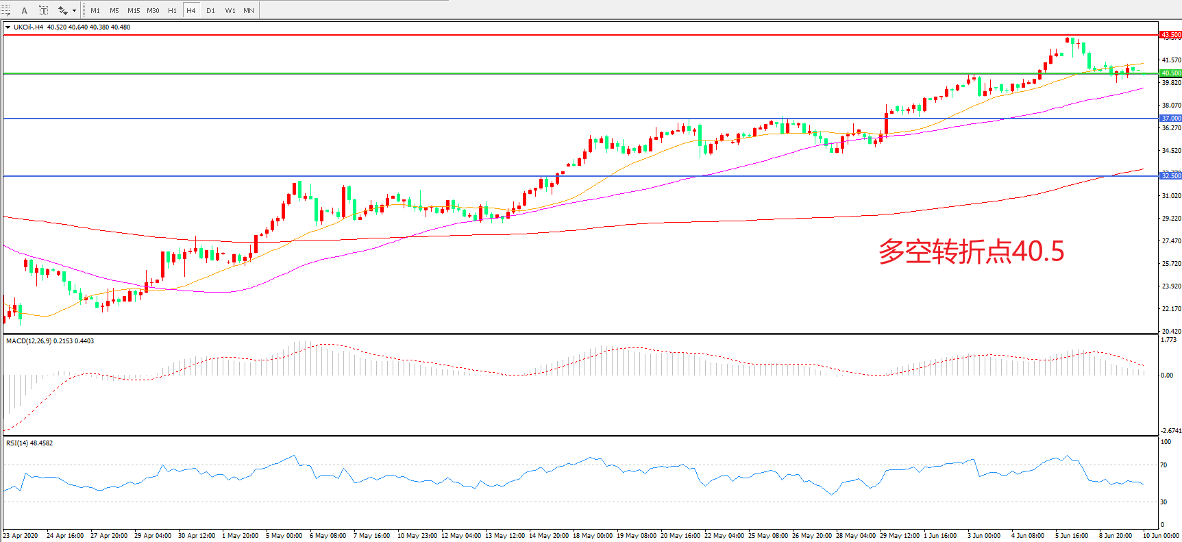 4小时图看,油价冲高回落,短期涨势有所放缓,40.5美元一线仍处是多空分水岭,均线系统仍呈多头排列,MACD红柱减少,RSI指标走平,日内延续震荡概率较大。
