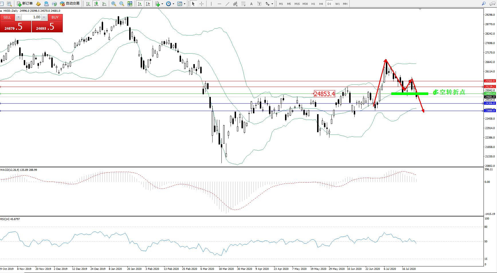 香港恒生指数7月24日(周五)收盘下跌557.67点,跌幅2.21%,报24705.33点;港股三大指数低开低走,收盘均大跌超2%。行业板块近乎全部下跌,中资券商股、半导体、药品股、科技股、汽车股、手游股等热门板块均重挫,恒指成份股中,腾讯大跌5.2%拖累恒指下挫157点,中国人寿、港交所均跌超4%。今日南下资金逆势净流入5.95亿港元,大市成交额为1666亿港元。今日上午,中国外交部通知美国驻华使馆,中方决定撤销对美国驻成都总领事馆的设立和运行许可,并对该总领事馆停止一切业务和活动提出具体要求。香港新增123例新冠肺炎确诊病例,单日新增数量连续第二天创疫情以来新高,其中本土病例115例,亦创下疫情以来新高。