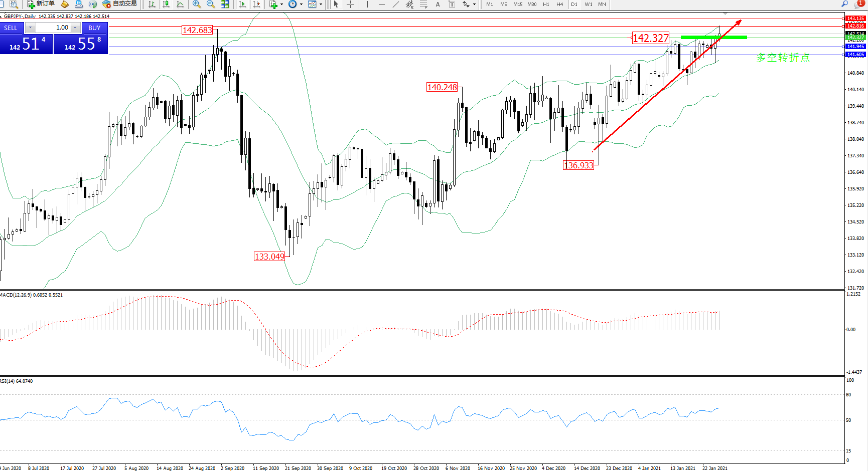 英镑兑日圆不断冲高后回撤至142.326附近整理,2021年英国可能会继续挣扎;英国很难通过发行债券吸引海外投资资金以支撑英镑,且英国央行仍存在实施负利率的可能性;风险敏感性较高的货币走强。而英国的强势,也多少与其国内快于他国的疫苗全民接种有关;避险货币日元、瑞郎和美元表现不佳,而风险敏感性较高的货币走强。英国广播公司报道首相约翰逊有望在下个月公布政府放松对英格兰地区防疫限制措施的标准。据了解,有关标准将包括死亡和住院人数,疫苗接种进度,病毒变异情况以及放松管控是否会导致疫情反弹。英国首相约翰逊称,对疫苗推出的速度感到沮丧,将会有一个吸取教训的时刻,但不是现在,690万人接种了新冠疫苗,英国是世界上拥有最严格的边境制度的国家之一,大臣将对红色名单国家采取更严厉措施,我们的边境制度是世界上最严格的。