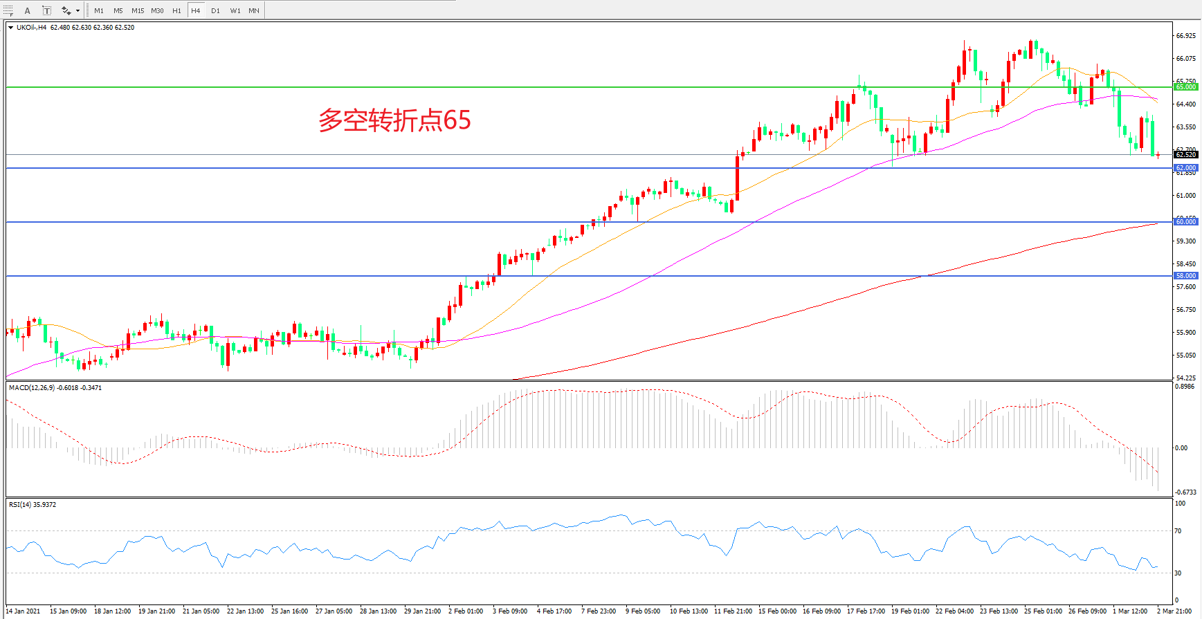 交易策略:  在65.00之下看跌,目标62.00    60.00