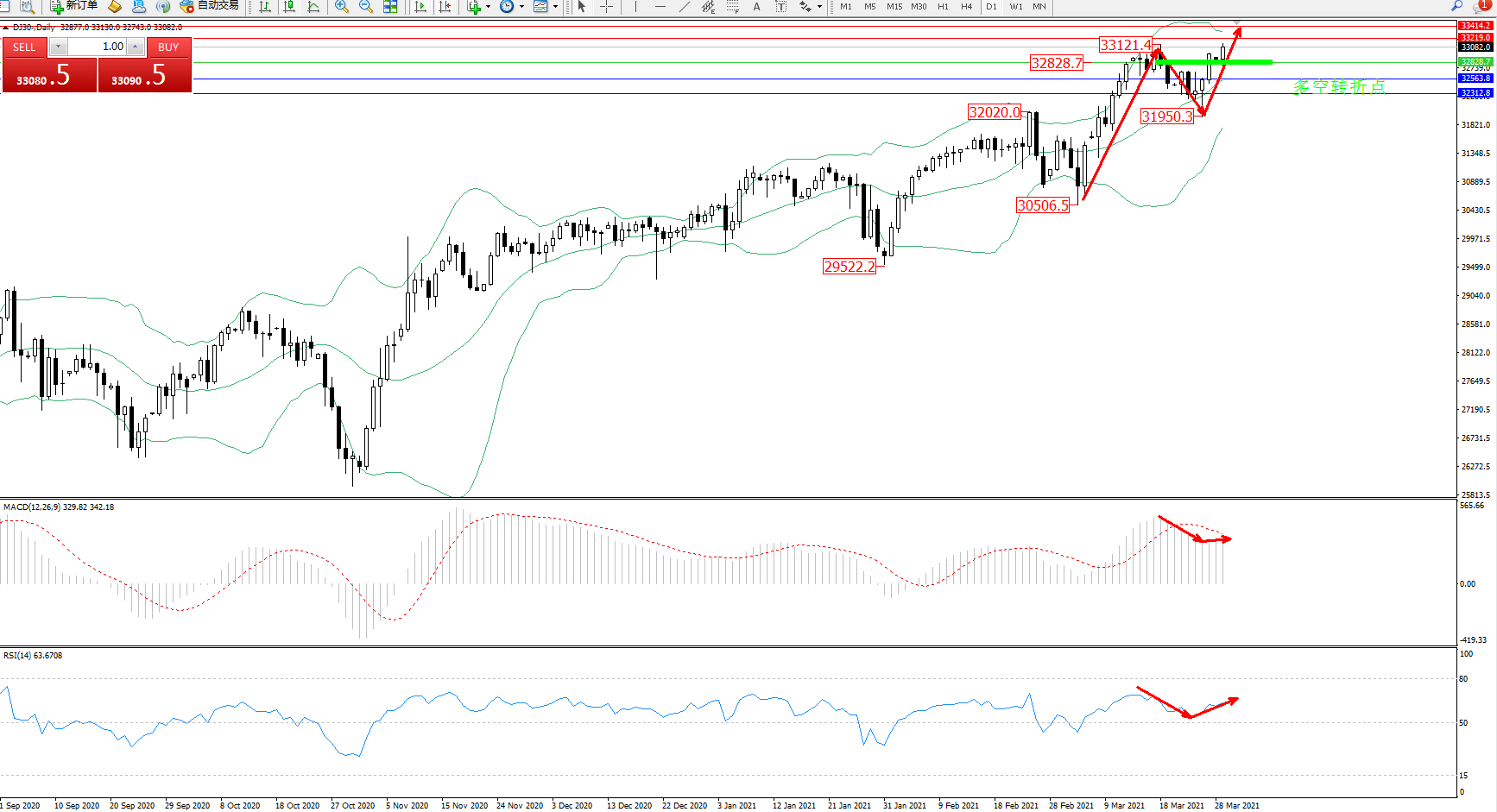 技术点评:多头动力延续布林带指标通道内持续震荡上扬,高位抵达33121位置后遇阻回撤,抵达31950位置得到支撑多头动力伺机入场反转上扬,多头不断向上拉升,布林带指标呈张口走势后开始收口向上移动,MACD指标处于多头区域高位整理平移,RSI指标处于多头区域高位弱势震荡回撤后开始反转上移;