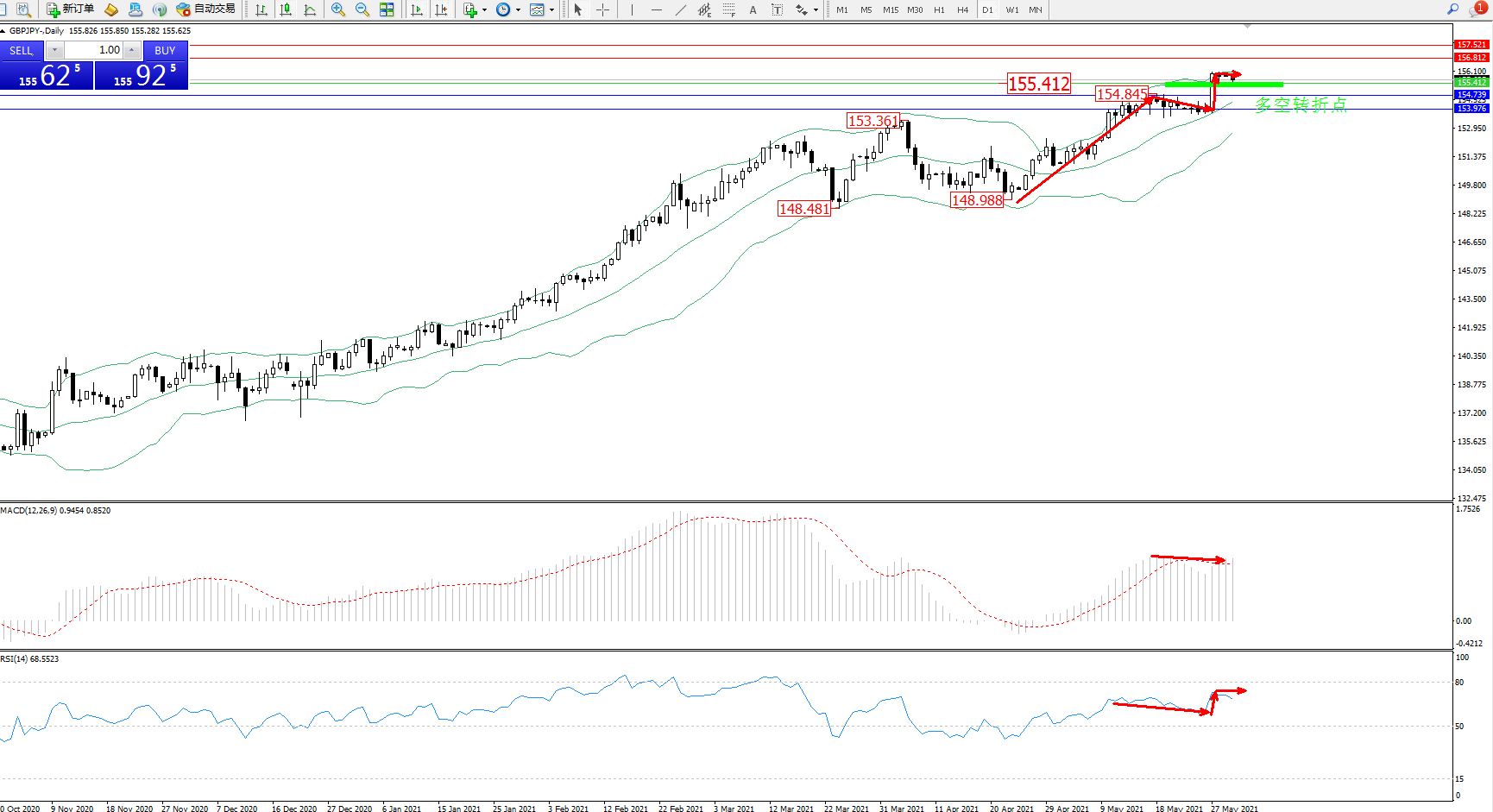 技术点评:多头动力延续布林带指标通道中上轨区间持续震荡上移,高位抵达154.845位置附近遇阻整理回撤,触及中轨附近节点后强势飙升是上轨附近节点维持整理,关注上轨附近节点,布林带指标高位呈缓慢收口迹象,MACD指标处于多头区域弱势整理徘徊中,RSI指标处于多头区域高位平缓下移后强势拉升;