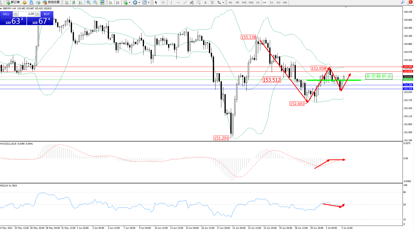 技术点评:空头动力延续布林带指标下轨附近持续震荡下行,低位抵达152.601位置后开始反转震荡上扬,纠结于布林指标通道中轨附近宽幅震荡中,布林带指标呈收口走势持续平移中,关注中轨附近节点,MACD指标处于空头区域低位弱势整理回升至0轴线附近徘徊,RSI指标处于50均衡线附近持续震荡中;
