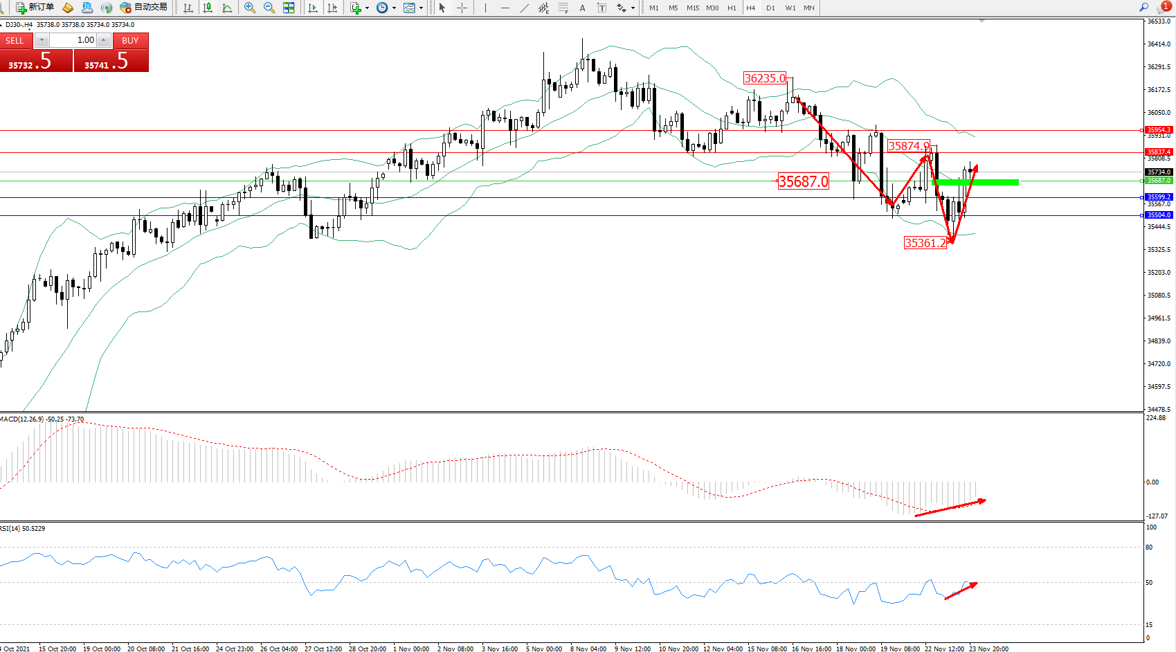 技术点评:空头动力延续布林带指标通道中下轨区间持续震荡下行,低位抵达35361位置节点后快速反转上移,突破布林带指标中轨进入中上轨区间整理,短期多头动力有持续回升迹象,布林带指标呈收口走势持续平移,MACD指标处于空头区域维持整理缓慢上移中,RSI指标处于空头区域持续震荡上移至50均衡线附近整理;