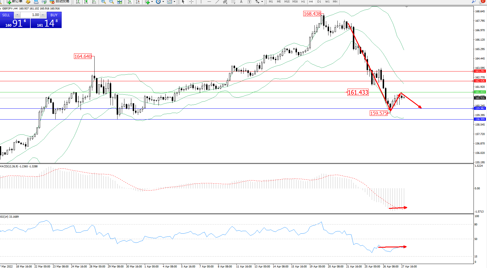 技术点评:空头动力延续布林带指标通道中下轨区间持续震荡向下移动,低位抵达159.757附近节点后短期回升,但市场整体下行趋势态势良好,布林带指标呈收口走势不断向下移动中,MACD指标处于0轴线下方持续震荡中,RSI指标处于50均衡线下侧弱势整理平移;