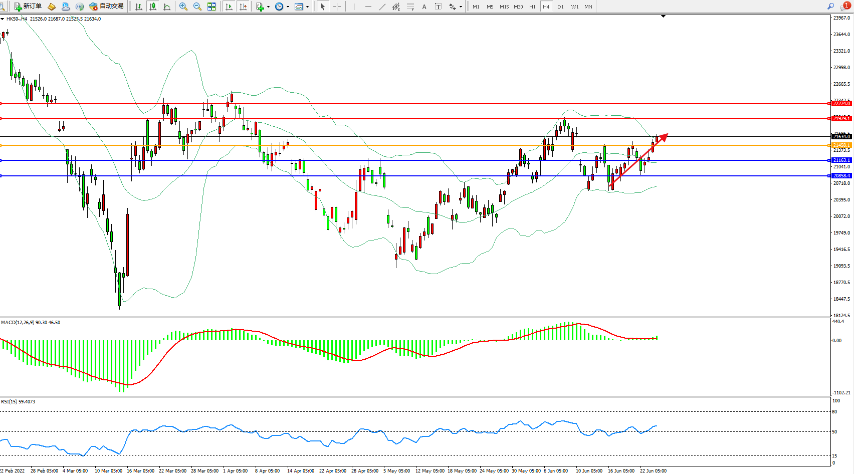 交易策略:21458上方看涨,目标21979、22274