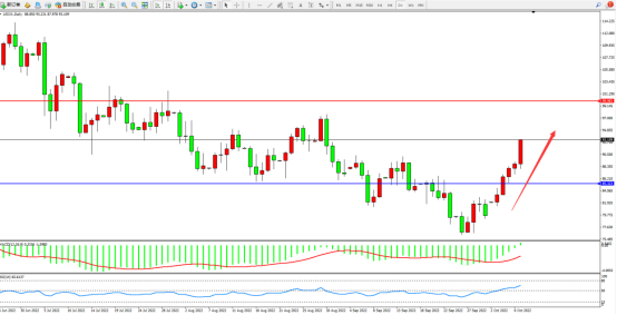 低位多头动力维持震荡持续拉升上扬,短期多头情绪开始涌入,市场看涨情绪开始升温,上方压制关注99.983附近,低位支撑关注85.323附近,MACD指标处于0轴线上侧徘徊,RSI指标处于50均衡线上侧持续震荡上移,如图: