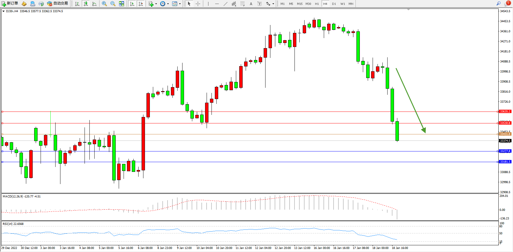 道琼斯指数1月18日(周三)收盘下跌614.22点,跌幅1.81%,报33296.63点;美国12月PPI年率录得6.20%,创2021年3月以来最小增幅,低于预期的6.80%和前值7.40%;12月核心PPI年率录得5.50%,低于预期的5.70%和前值6.20%。
