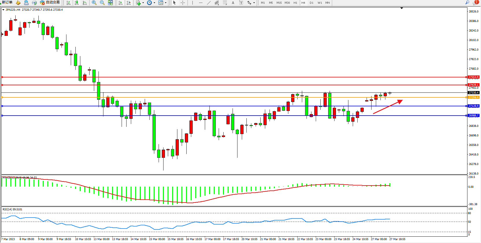 日经225指数3月27日(周一)收盘上涨106.25点,涨幅0.39%,报27491.50点。日本最新通胀情况显示,整体消费者价格指数从4.3月份的3.3%下降至0.6月份的4.2%。环比下降至-3.1%。