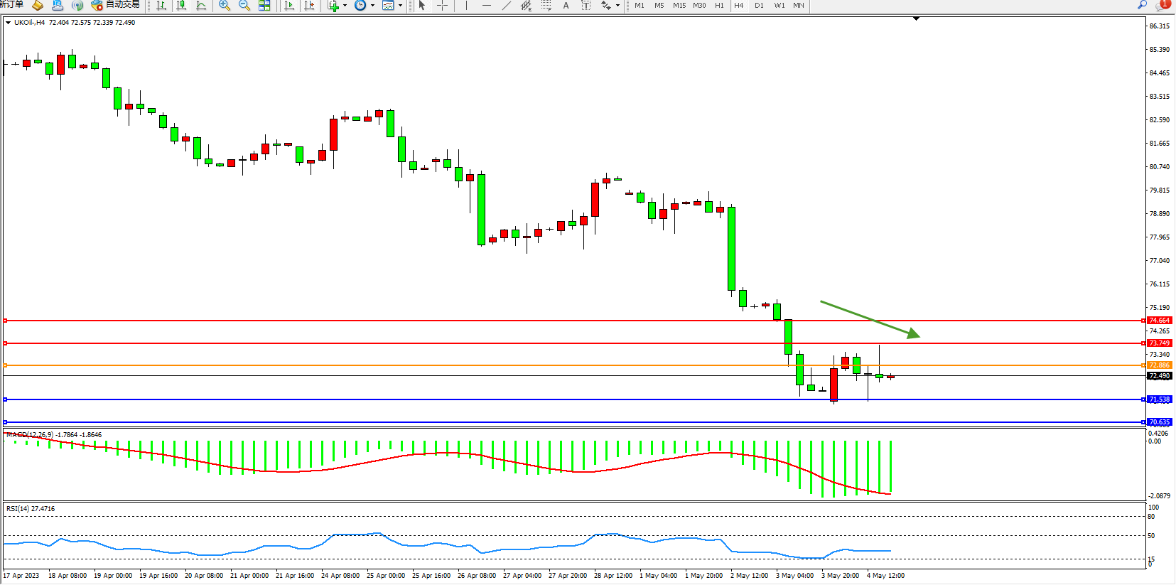 4小时图看:空头动力维持震荡下行后,低位短期窄幅震荡,空头动力有所减弱,但市场整体依旧处于下行趋势中,MACD指标处于空头区域低位整理,RSI指标处于空头区域低位弱势徘徊;